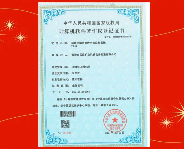 榮獲防靜電輸藥管靜電值監(jiān)測(cè)系統(tǒng)著作權(quán)登記證書(shū)