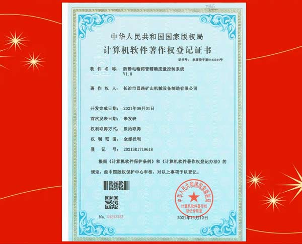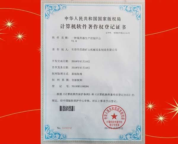 榮獲裝藥器生產(chǎn)控制平臺(tái)著作權(quán)登記證書(shū)
